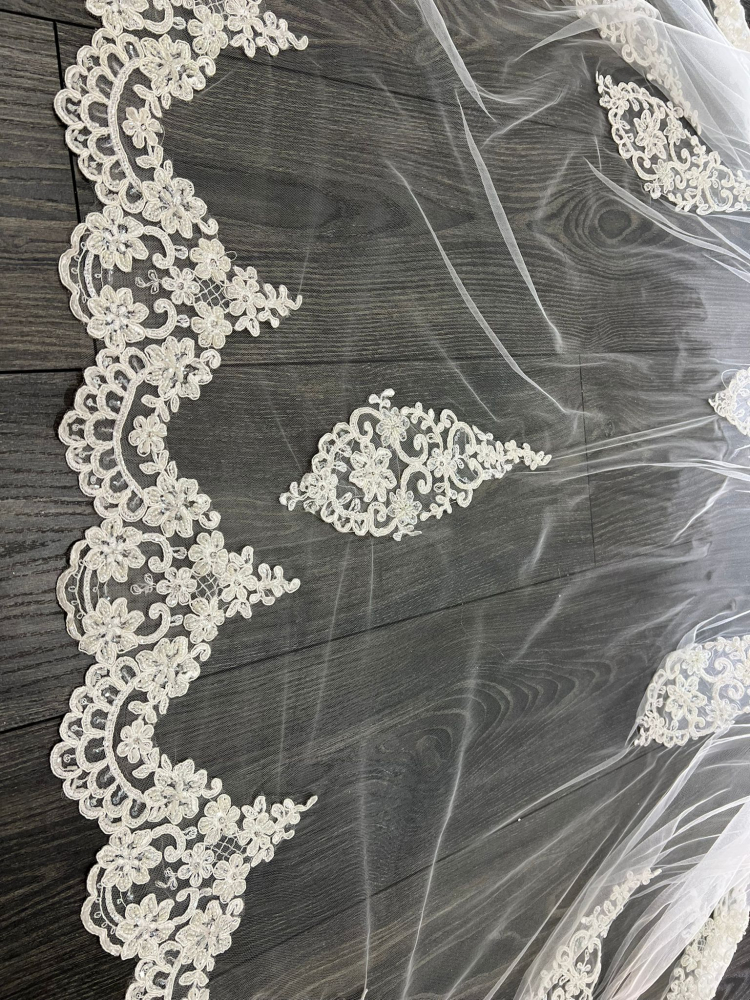 A timeless elegant veil, the Alexandra features an intricate corded and beaded lace edge with delicate beadwork for a luxurious finish. This style enhances the bridal gown with graceful detail.