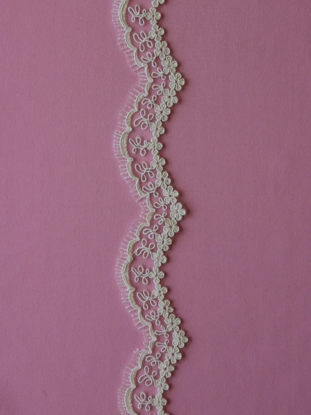 An Ivory tulle based lace edge trim featuring a row of small embroidered daisy like flowers. This delicate narrow trim is finished with a scalloped edge to add gentle movement.