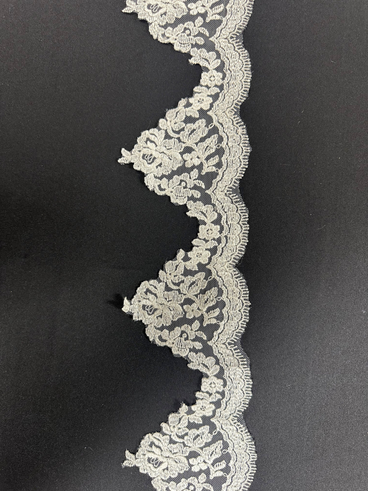 A graceful understated lace trim that adds detail without overwhelming the dress. Lustrous floral motif detail with a single scalloped edge.
