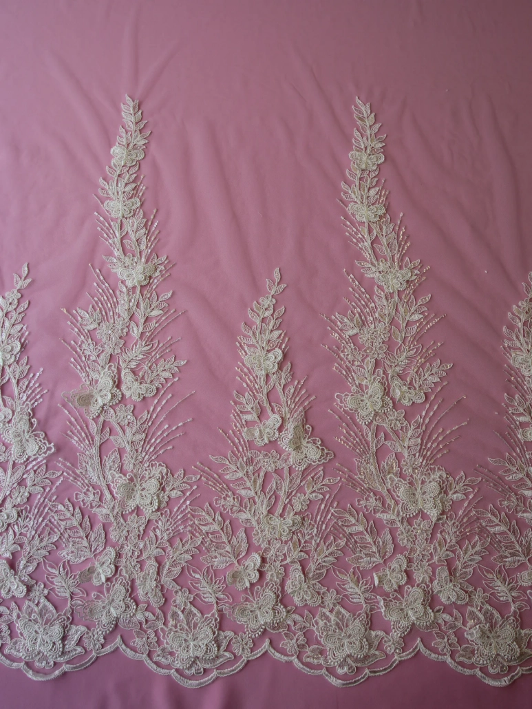 A whimsical floral embroidered detail featuring 3D butterflies of varying sizes. A breathtaking bridal lace giving a dramatic effect. The floral spikes rise to 73cm at the highest point. An asymmetrical design creating a truly eye catching effect.