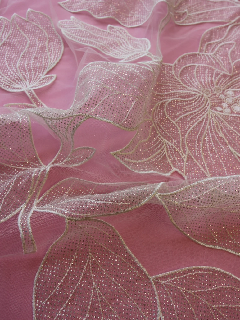 Add some sparkle to your dress with this unique glamour veil. A modern fashion forward look with this feminine, floaty fabric featuring oversized Iris flowers with leafy motifs. Each element has a subtle sparkle with a fine dusting of glitter over each design.