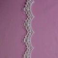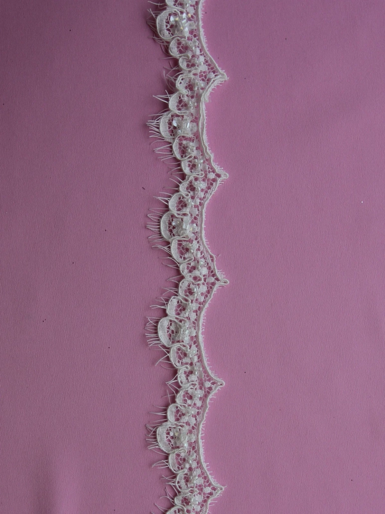 A beautifully detailed narrow Ivory beaded lace trim. Intricate embellishments detail this scalloped and corded edge trim with an asymmetrical eyelash edge for a soft finish. Adorned with delicate clusters of three beads scattered throughout the design, with sequins placed at every point adding subtle sparkle and texture.